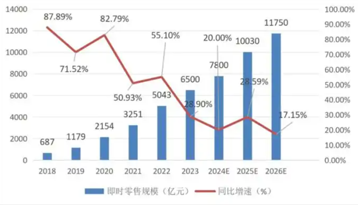 根據商務部《即時零售行業發展報告(2024)》預測,2025年即時零售規模將超過萬億元,到2030年將超過2萬億元,未來5年CAGR約為15%。線下零售在萎縮,電商的GMV增速在逼近0,只有即時零售成為稀缺的成長賽道。