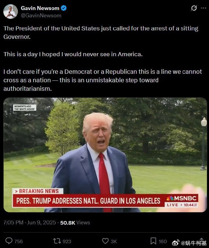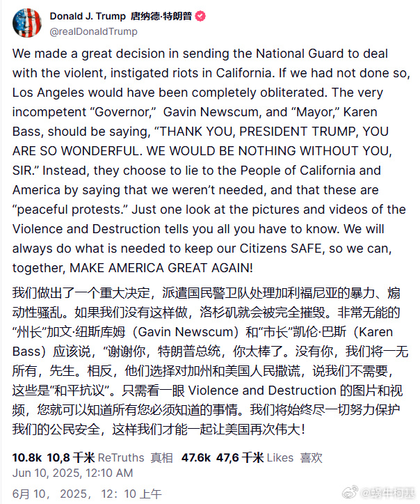 特朗普表示沒有他派遣國民警衞隊的話,洛杉磯早完蛋了,無能的“州長”和“市長”應該説謝謝。