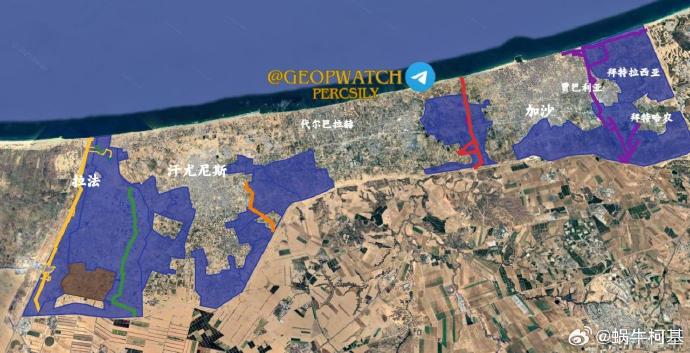 以色列實施大規模地面進攻基甸戰車三週後的局勢情況,有顏色的豎線是以色列要將加沙地帶分割的數條走廊,本週以色列主要在汗尤尼斯取得進展,其他方向收效甚微,加沙城周邊甚至還吐了一些出來。