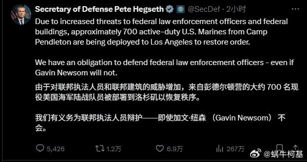 美國國防部長赫格塞斯表示,約有700名海軍陸戰隊員已被部署到洛杉磯平息抗議活動。