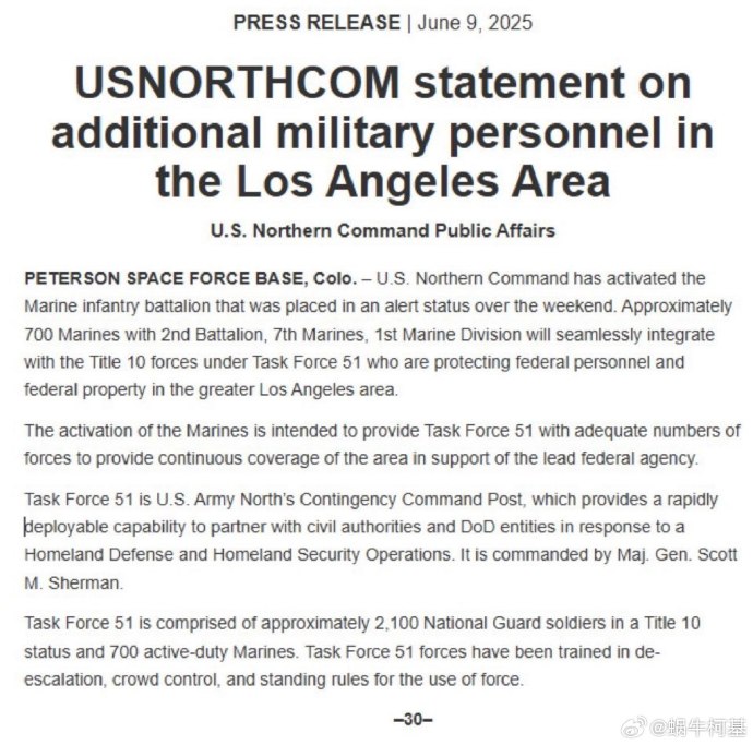 美國北方司令部宣佈,第1海軍陸戰師第7團第2營的約700名海軍陸戰隊員將與洛杉磯地區的第51特遣隊整合,以保護大洛杉磯地區的聯邦人員和聯邦財產。