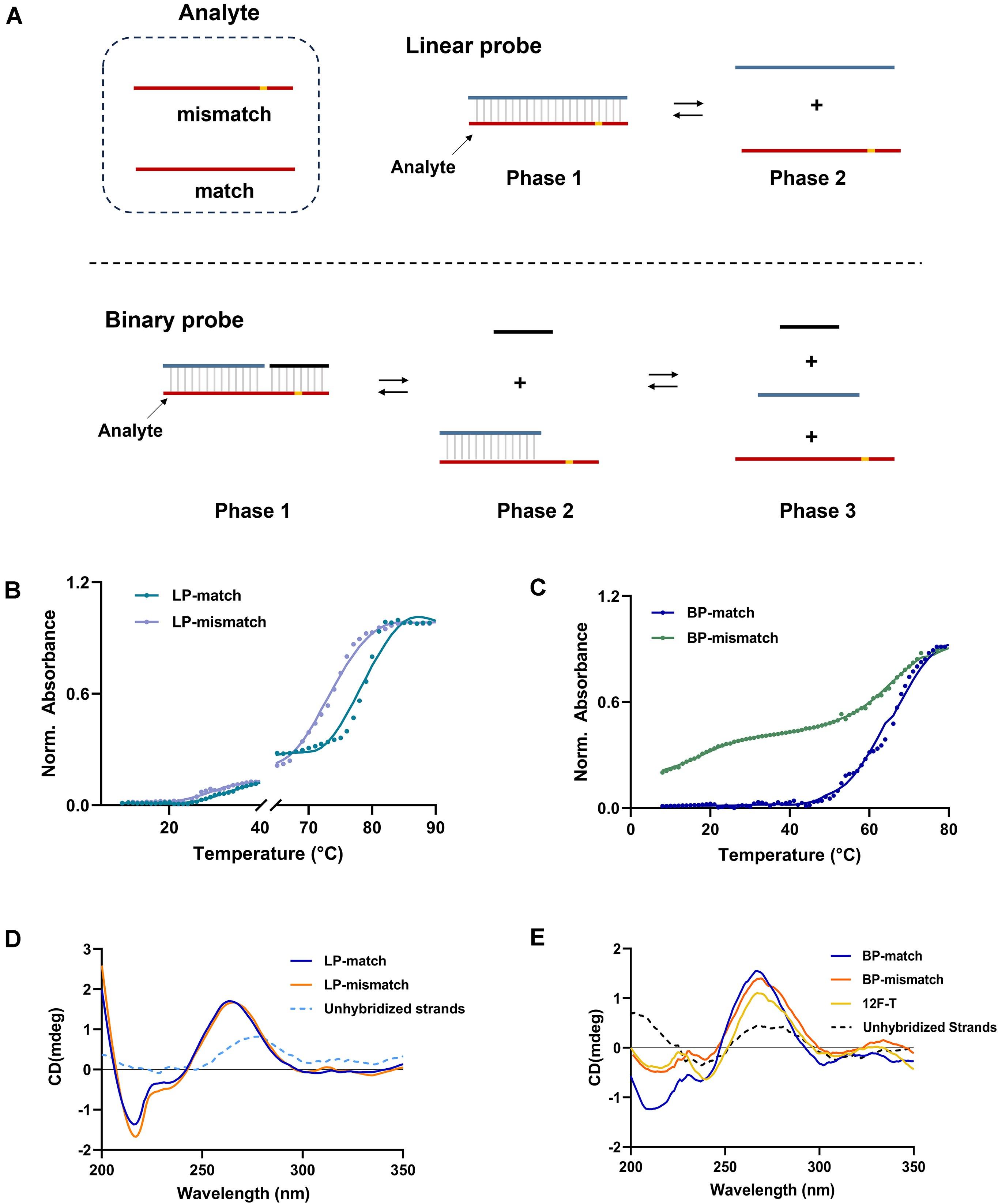 紫外熔解實驗結果顯示二元探針(binary probe,BPs)在25°C至50°C範圍內表現出穩定的雜交特性,而線性探針(linear probe,LPs)僅在高於68°C時才表現出顯著的雜交特性;圓二光譜分析觀察到BPs在匹配目標時表現出典型的RNA/DNA雙鏈特徵,而在錯配目標時信號顯著減弱。結果表明BPs在較寬的温度範圍內表現出穩定的雜交特性,且在識別錯配目標時表現出顯著的能量懲罰,增強了對SNV的區分能力。