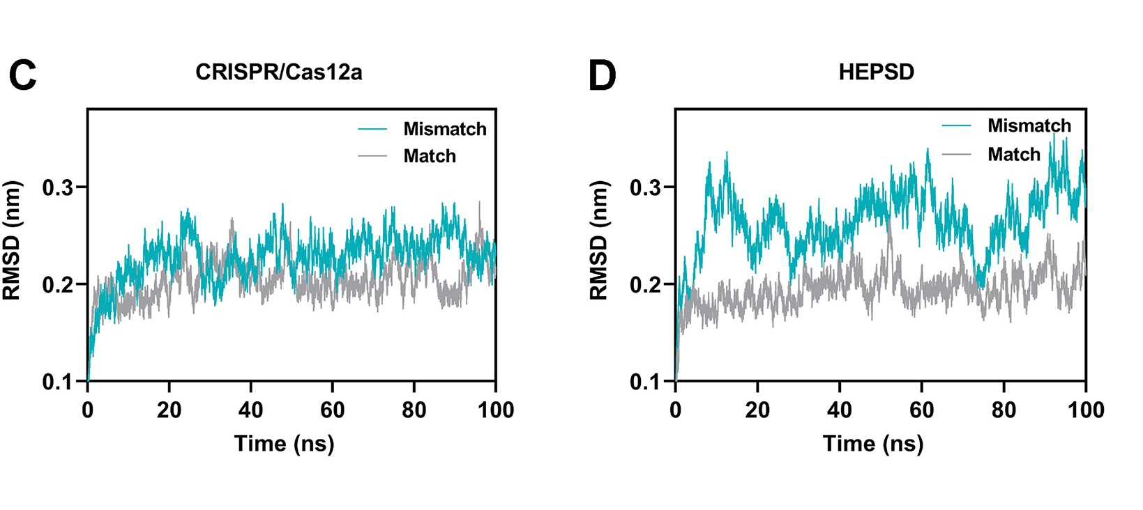 為了瞭解HEPSD系統在識別匹配和不匹配目標時的雜交動力學,研究人員進行了分子動力學模擬研究。均方根偏差(RMSD)分析結果顯示,匹配目標的RMSD值在10 ns後穩定,而錯配目標的RMSD值持續波動。該結果説明了HEPSD平台在識別錯配目標時表現出動態不穩定性,而在匹配目標時則表現出穩定的結合,進一步證實了其高特異性檢測能力。