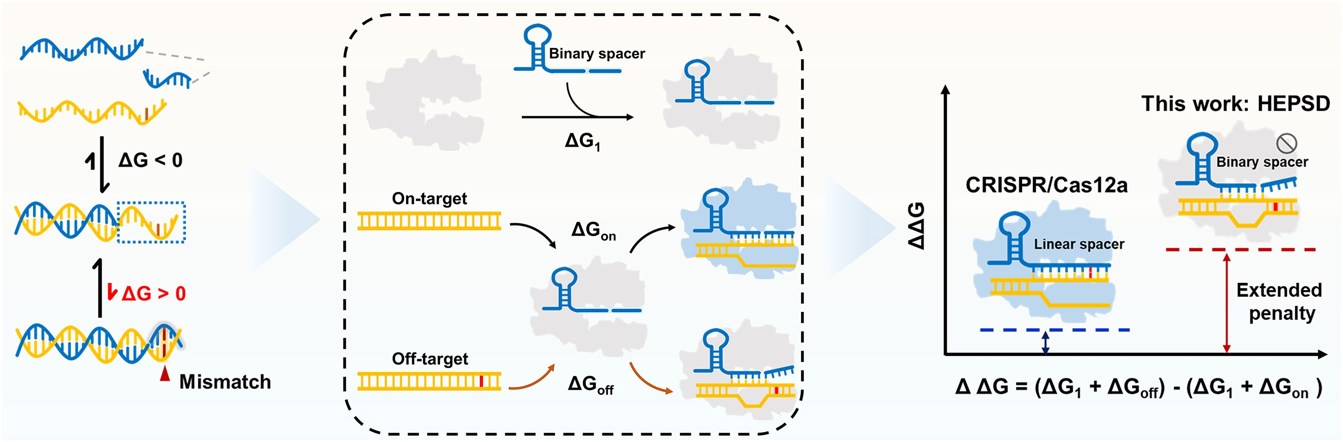研究人員為此設計了一種二元crRNA架構,通過非平衡雜交驅動的調控機制,放大了單核苷酸錯配的能量懲罰。這種設計稱為高能量懲罰 SNV 檢測(high-energetic-penalty SNV detection ,HEPSD)平台。它使得CRISPR/Cas12a系統在整個靶向區域內對基因組DNA中的突變表現出顯著的偏好,同時防止了由單個錯配核苷酸誘導的假激。