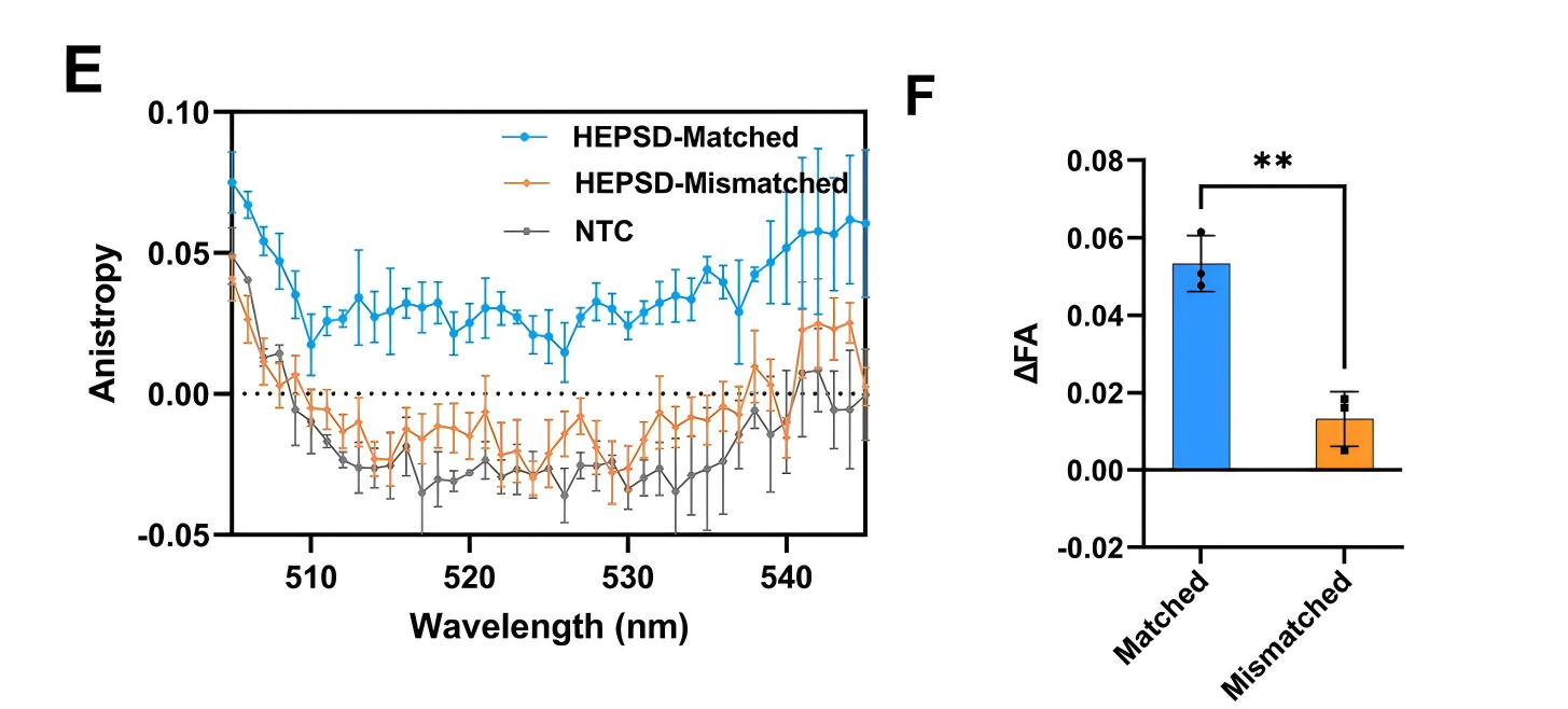 通過熒光各向異性測量研究HEPSD平台在識別匹配和錯配目標時的結合穩定性時發現,匹配目標的熒光各向異性值較高,而錯配目標的熒光各向異性值較低。結果説明HEPSD平台在識別錯配目標時表現出較低的熒光各向異性值,表明其結合較弱,進一步驗證了其高特異性。