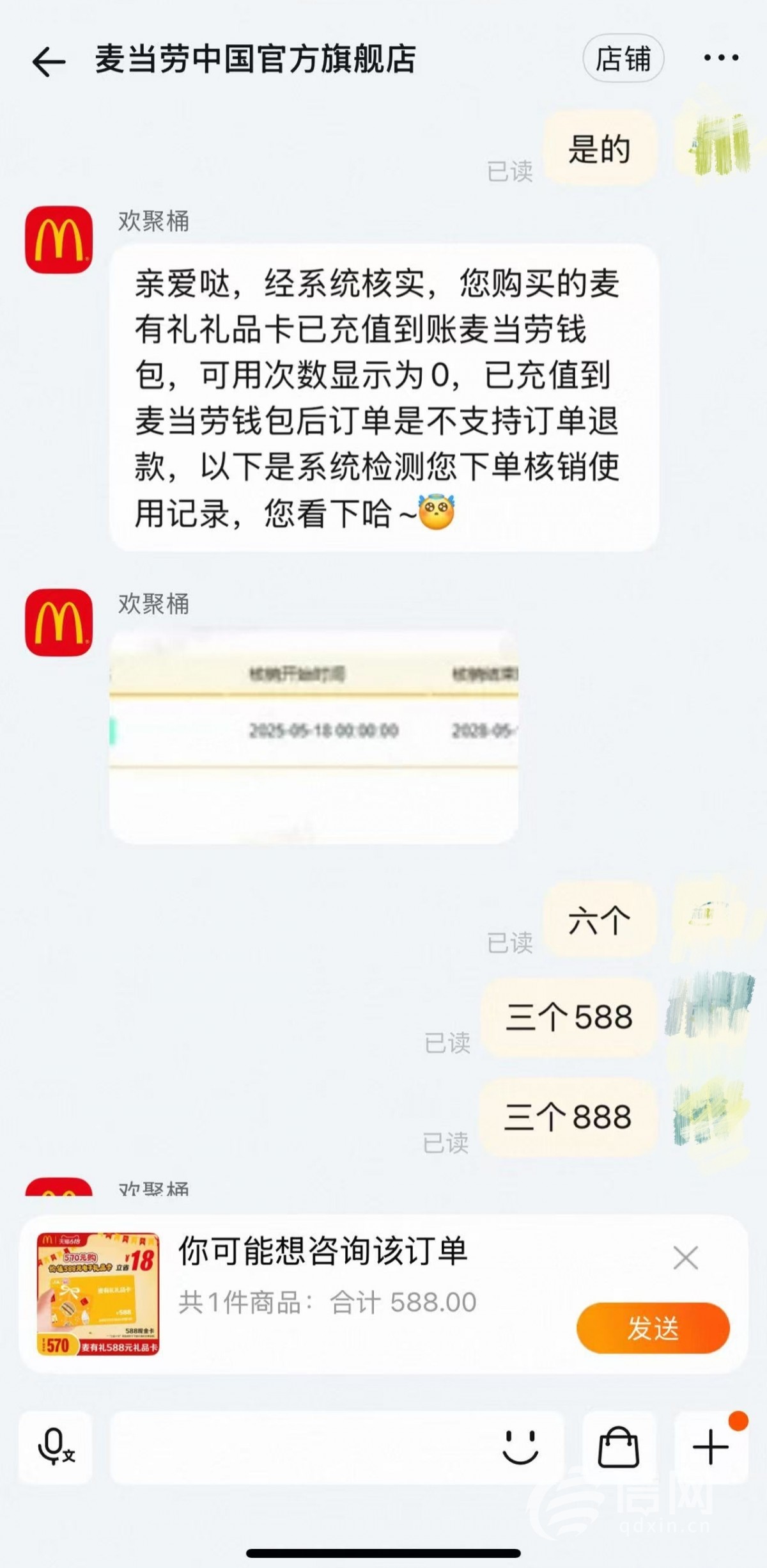 張女士告訴信網,與自己有着類似遭遇的人不在少數。僅她所在的維權微信羣內就有135名羣友,被騙金額從幾百元至數萬元不等。其中,有一位“旗袍代拍”的受害者被騙子通過話術層層誘導,甚至利用網貸平台及信用卡套現,累計被騙近13萬元。在發現被騙後,張女士曾第一時間聯繫淘寶客服和商家,希望能追回款項,卻被告知“麥有禮禮品卡已充值至麥當勞錢包,充值成功的訂單不支持退款。”