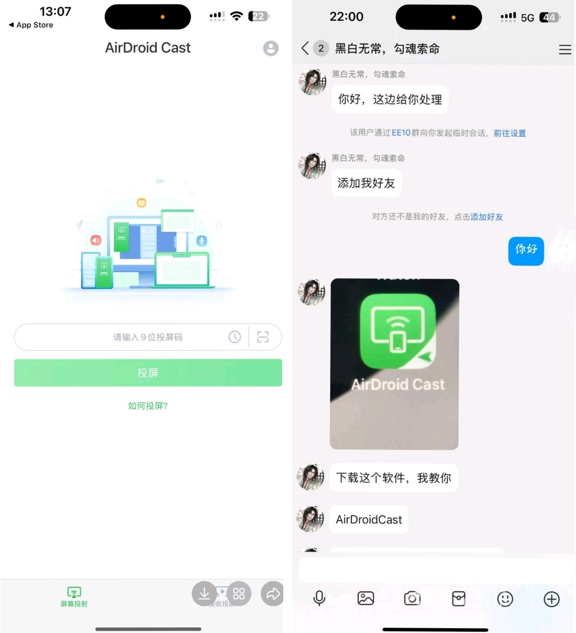 在張女士急於退款之時,詐騙分子也開始了他們下一步的“套路”。對方以財務處理退款為由,先是讓張女士添加指定QQ賬號,通過私信誘導其下載一款名為“Air Droid Cast”的屏幕共享軟件,進入後需要輸入9位數的投屏碼進行操作才可退款。據張女士介紹,一旦在該軟件中輸入對方提供的投屏碼,自己的手機屏幕將會被對方即時監控,付款時的支付密碼及短信驗證碼等敏感信息也會隨之暴露。至此,張女士發覺其中存在問題,果斷停止操作,這才避免了遭受進一步的損失。截至發稿,她此前在淘寶麥當勞中國官方旗艦店下單的6筆共計四千餘元的訂單款項仍無法退回。