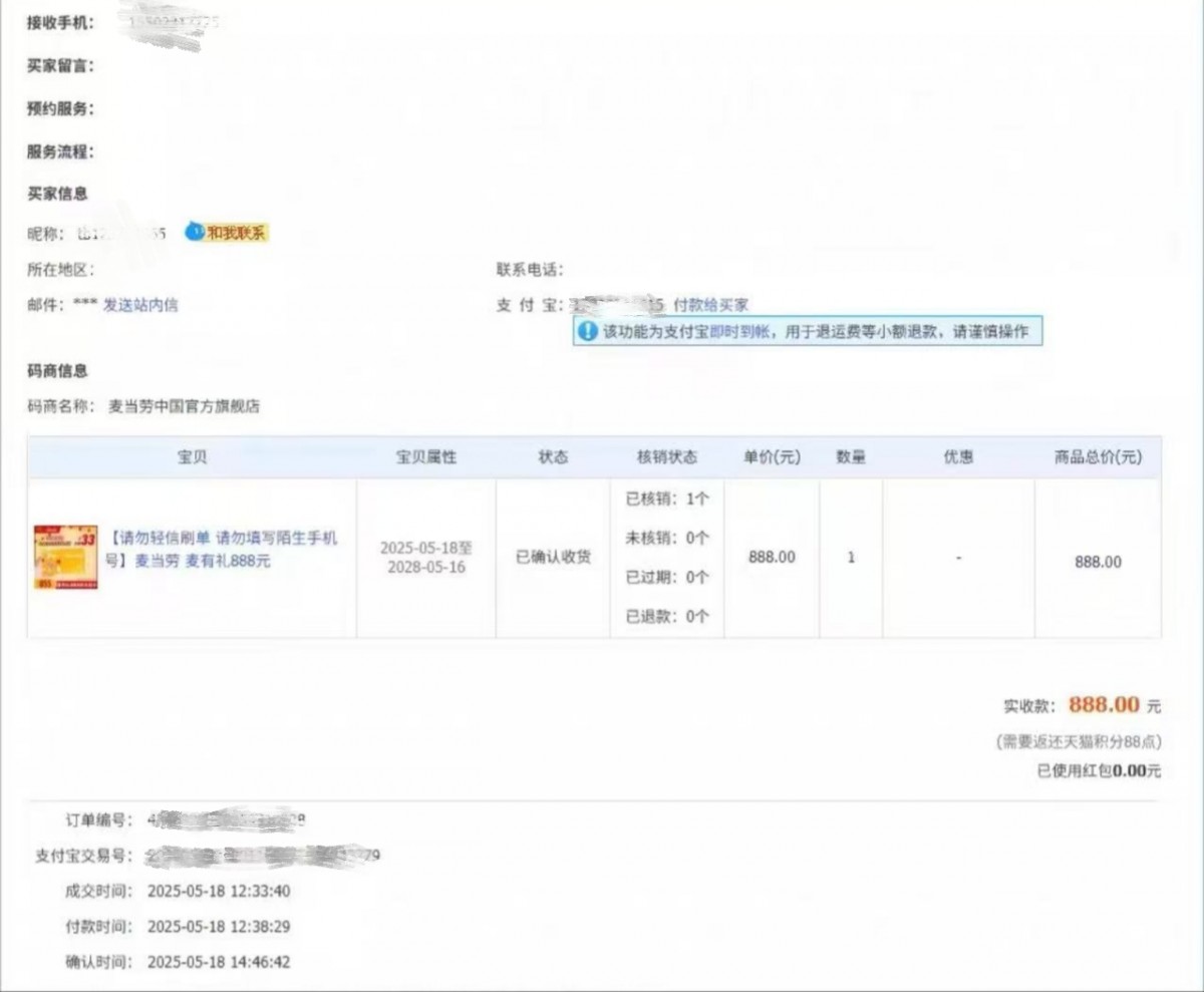 信網在採訪的過程中瞭解到,淘寶麥當勞禮品卡的使用核銷流程較為特殊,消費者在下單時需輸入正確的手機號,後續憑藉該手機號登錄麥當勞App的麥當勞錢包,點擊充值即可將禮品卡金額轉入錢包餘額。值得注意的是,一旦禮品卡金額成功充值至麥當勞錢包餘額,平台的禮品卡訂單便無法進行退費。而詐騙分子正是利用這一規則漏洞,在受害者察覺前快速完成核銷,導致退款通道被切斷。大部分遭遇詐騙的消費者因此陷入無法成功退費的困境,從而進一步加大了資金追回的難度。