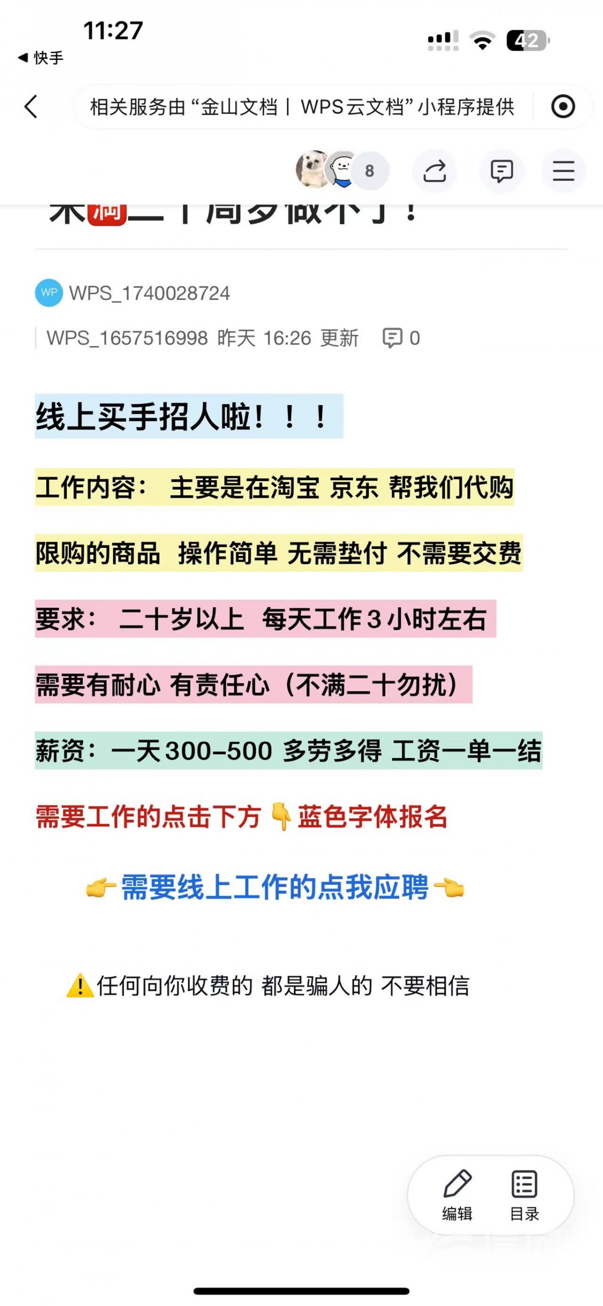 “看到博主有20多萬粉絲,以為是正規兼職。”近日,張女士向信網反映,自己此前在快手App上看到一個擁有20多萬粉絲的博主發佈招聘線上兼職的視頻,出於兼職掙錢的目的,自己點擊進入了該博主的私信頁面。對方以“提高商家銷量”“一單一結輕鬆日入百元”為由,引導其通過WPS雲文檔鏈接進入微信羣。入羣后,對方要求張女士提供芝麻信用分、花唄額度等頁面截圖,隨後發送了一個二維碼鏈接和6個手機號碼,稱“按照要求掃碼下單即可完成任務”。