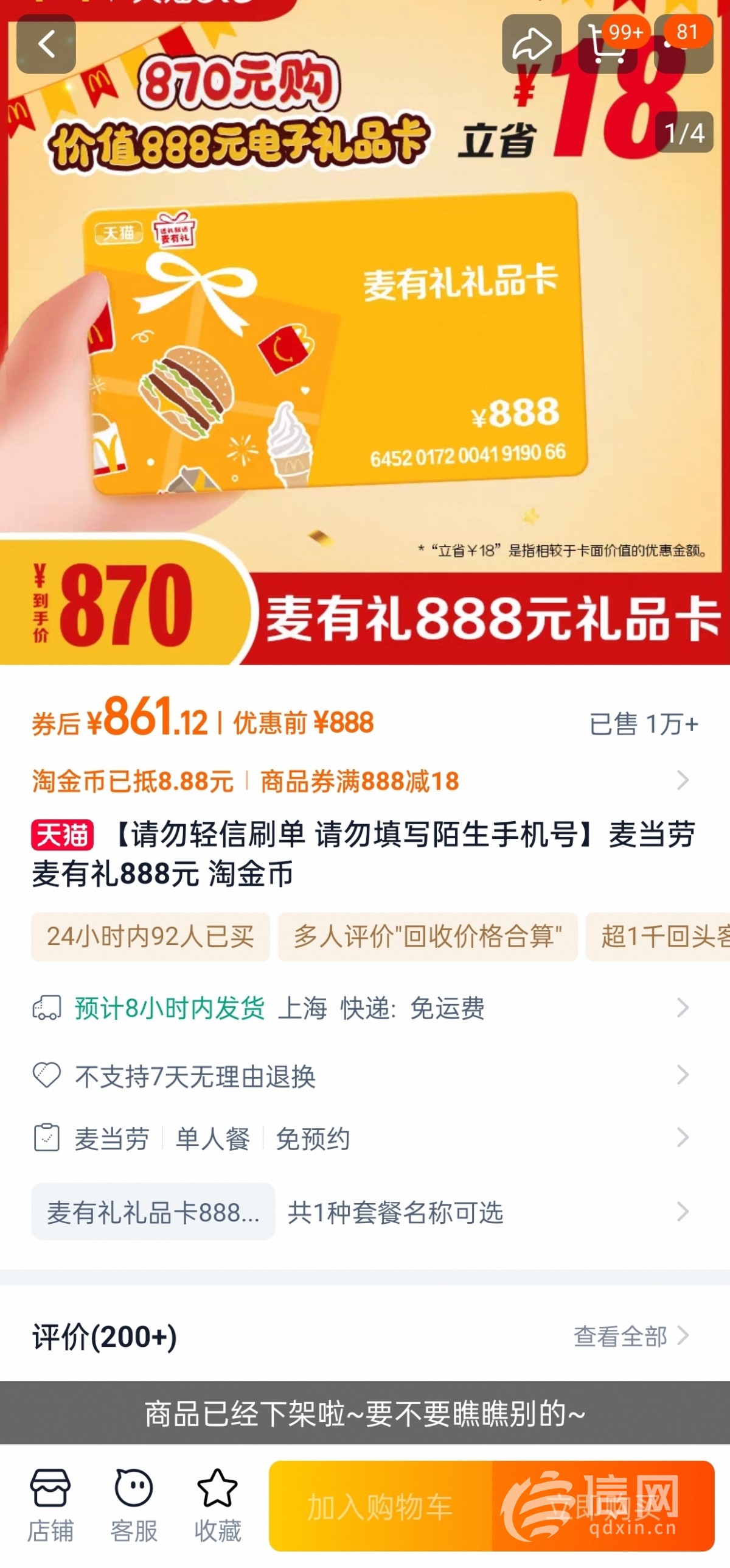 淘寶平台官方工作人員向信網表示,已記錄相關情況,後續將就此問題安排專人對涉事店鋪及可疑鏈接展開調查。針對消費者集中反映的“刷單引流”問題,平台將評估是否對相關鏈接進行下架處理,並安排專員與受騙消費者對接,核實相關情況,同步處理進展及解決方案。截至發稿前,淘寶平台麥當勞中國官方旗艦店“麥有禮”禮品卡相關鏈接已下架。