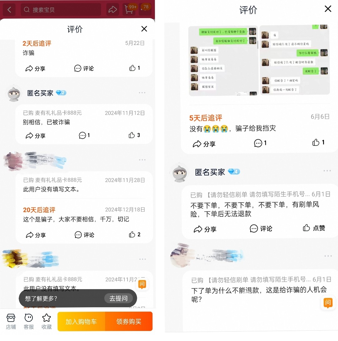信網調查發現,淘寶平台麥當勞中國官方旗艦店上架有588元、888元兩種面值的“麥有禮”禮品卡,其評論區及“問大家”互動板塊中,大量買家留言稱因貪圖佣金參與刷單被騙。從2024年下半年至2025年6月1日,相關投訴的時間跨度長達數月,受騙者覆蓋範圍廣泛,人數眾多。此外,信網在小紅書、快手等主流社交平台搜索發現,“招刷單兼職”“招買手”等引流帖子仍未絕跡,部分內容疑似與詐騙相關。