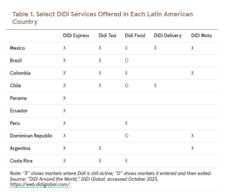 滴滴在各拉美國家提供的部分服務類型,“X”表示滴滴仍在運營的市場;“O”表示滴滴曾進入但已退出的市場,統計截止2023年10月