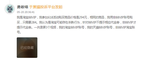 在黑貓投訴平台上,輸入“88VIP 殺熟”,能看到大量投訴案例。消費者們紛紛控訴,自己作為88VIP會員,不僅沒有享受到應有的優惠,反而在購物時被區別對待,價格比非會員還高。