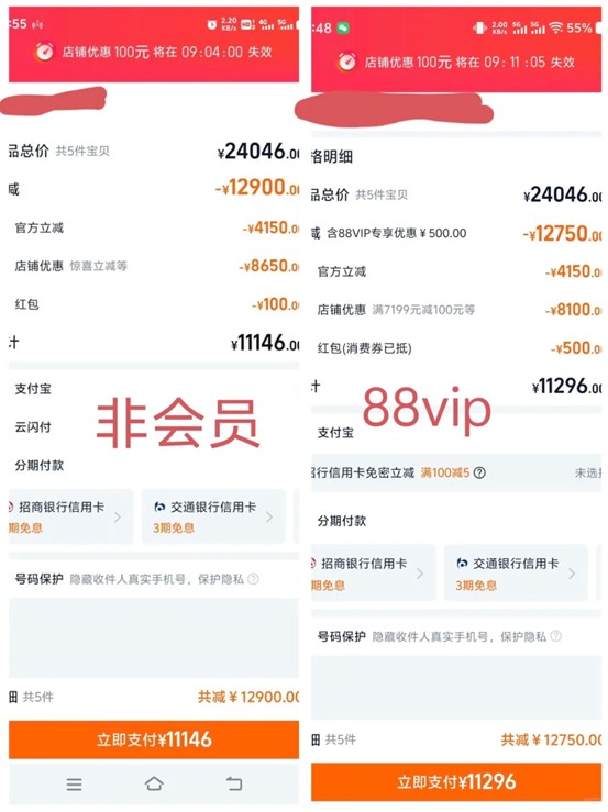在小紅書上,一位88VIP會員分享了自己購買經歷。他看中了幾款產品,同個時間段,東西鏈接一樣,88VIP的賬號顯示的總額是11296元。然而,非會員賬號的店鋪優惠卻更優惠,算下來到手價只需11146 元,比他這個88VIP會員便宜了150元。“以前覺得88VIP很划算,現在感覺被狠狠套路了,以後真得好好比價。”他無奈地説道。