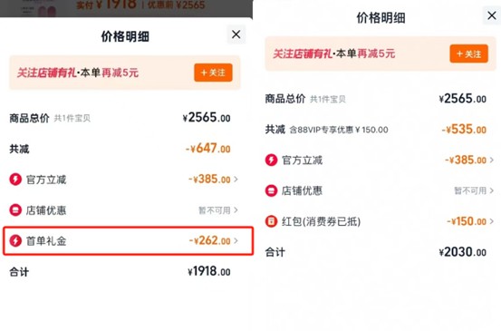 面對鋪天蓋地的“殺熟”質疑,淘寶官方客服給出了諸如“動態定價”“系統根據用户情況推薦不同優惠券”之類的常見解釋。但部分細心的消費者卻發現,價格差異的背後,藏着一個名為“首單禮金”的關鍵因素。