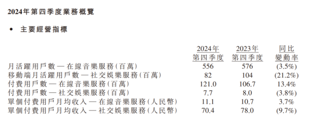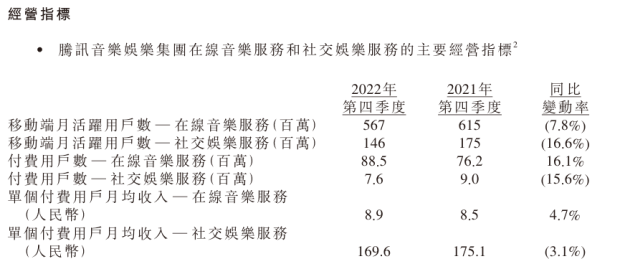 從用户指標看,騰訊音樂的月活躍用户數已經從 2019 年四季度頂峯的 6.44 億回落到去年四季度的 5.56 億。