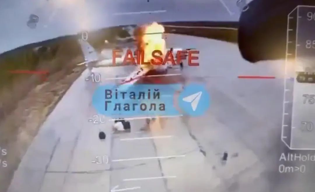 部分視頻顯示,疑似部署在機場跑道上的俄軍機圖-95戰略轟炸機遇襲,機翼根部瞬間爆炸,燃起大火。
