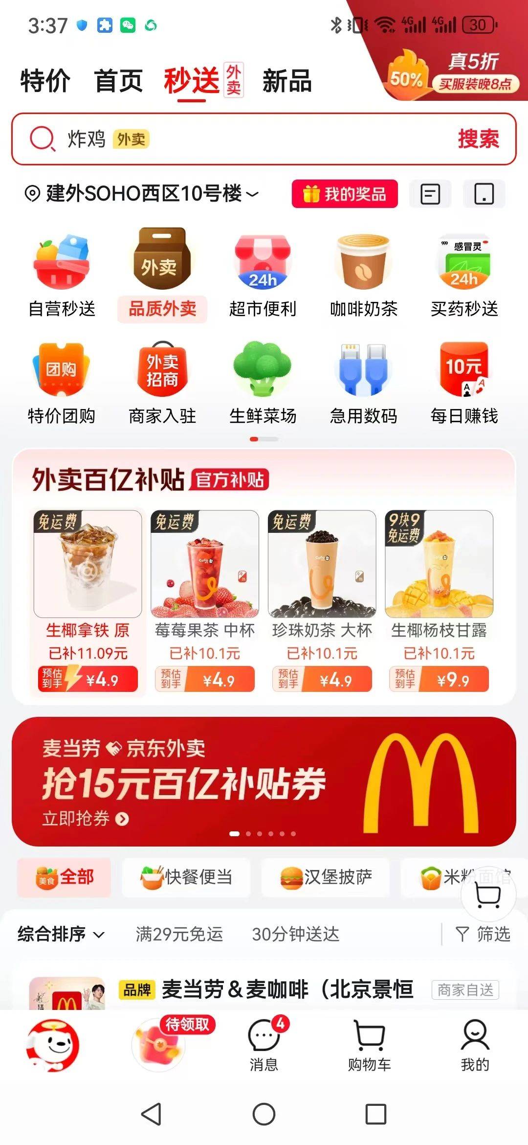 但是與美團、餓了麼等平台不同,京東外賣並非獨立APP,而是嵌入在京東APP內。(京東APP首頁—秒送—品質外賣)