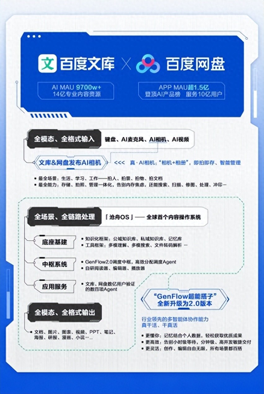 在全模態、系統化完整交付能力上,在輸入端,百度文庫、網盤擁有文字、語音、圖片、視頻等全模態、全格式輸入能力,全天候、全方位接受並響應用户需求;在處理端,百度文庫、百度網盤聯合推出的內容操作系統「滄舟OS」,擁有對用户海量公私域內容、記憶庫的全場景、全鏈路處理能力,通過中樞系統實現Agent之間的數據互通和智能調度;文庫、網盤已被數億用户驗證的數百項Agent,可以靈活匹配各種任務需要,最終實現全模態、全格式內容的端到端輸出。