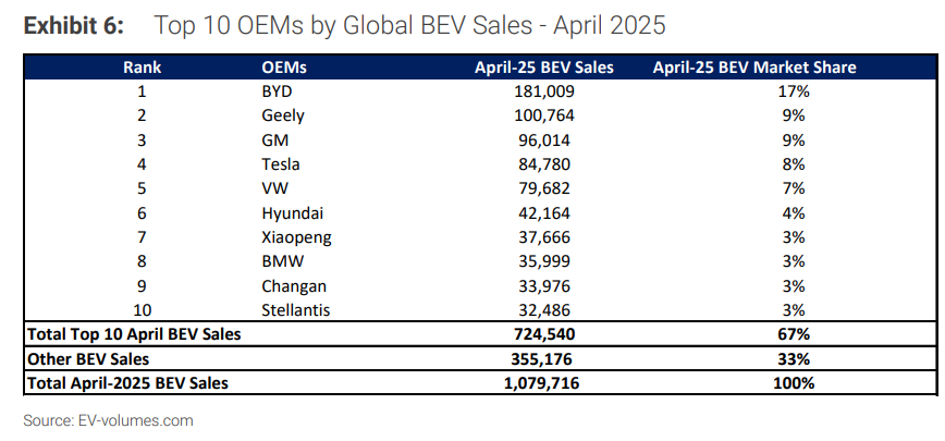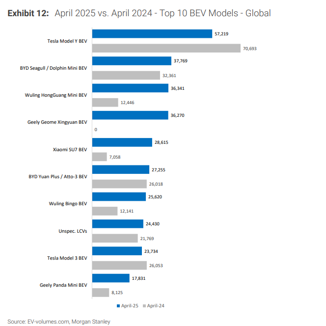 摩根士丹利在這份題為《全球電動汽車追蹤:中國電動汽車統治時代》的報告中指出,4月,比亞迪、吉利銷量位居前二,而特斯拉銷量退居第四位,其全球市場份額從去年同期的10.7%下滑至7.9%。