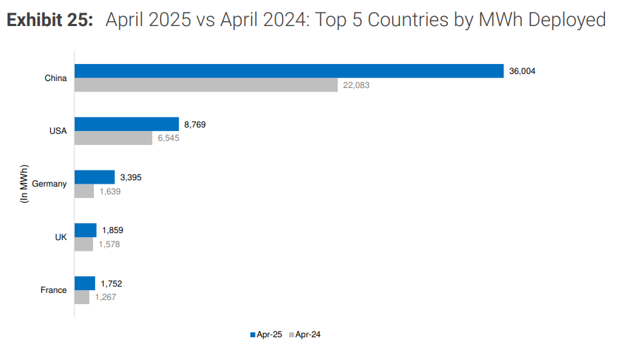 在電池技術層面,中國製造商同樣佔據優勢地位。報告稱,4月份全球電池部署量達6.68萬MWh,同比增長32%。