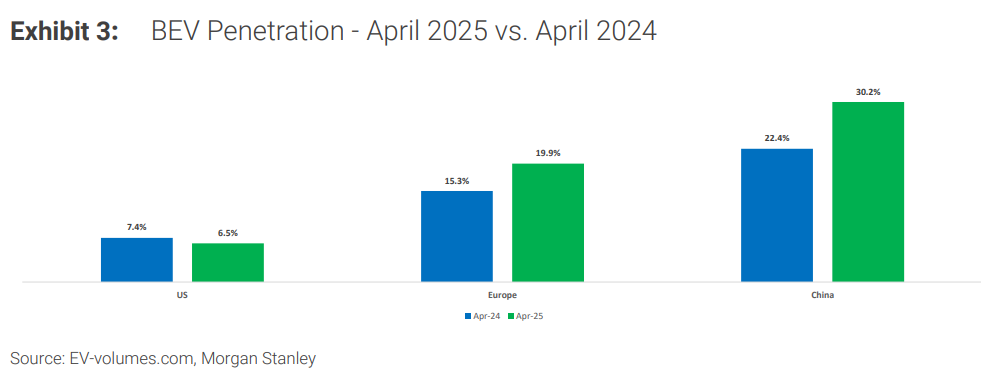 相比之下,美國市場表現疲軟,銷量9.54萬輛,同比下降4%,滲透率從去年的7.4%下滑至6.5%。