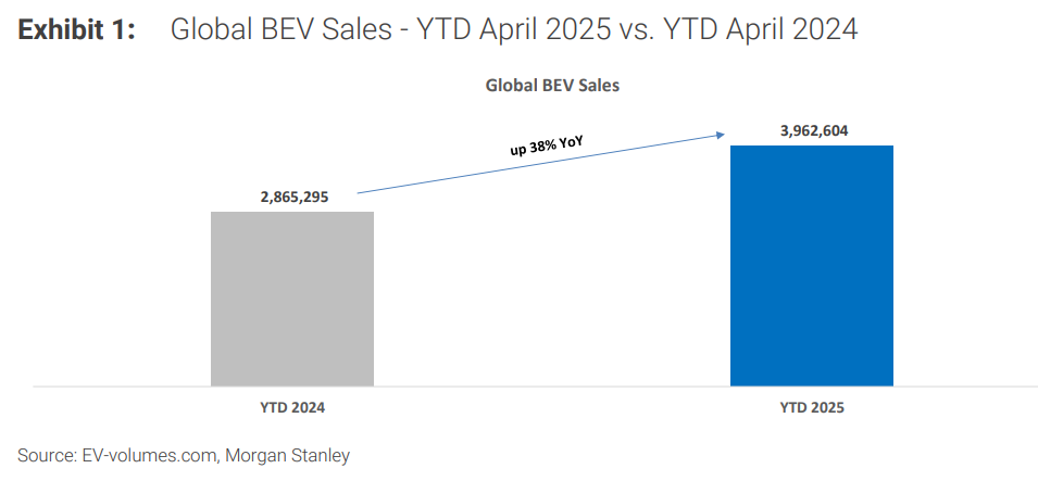 據追風交易台消息,摩根士丹利最新發布的4月全球電動車市場數據顯示,2025年4月,全球純電動車銷量同比增長38%至107.97萬輛,其中中國市場貢獻了超過六成的銷量,同比增速51%。