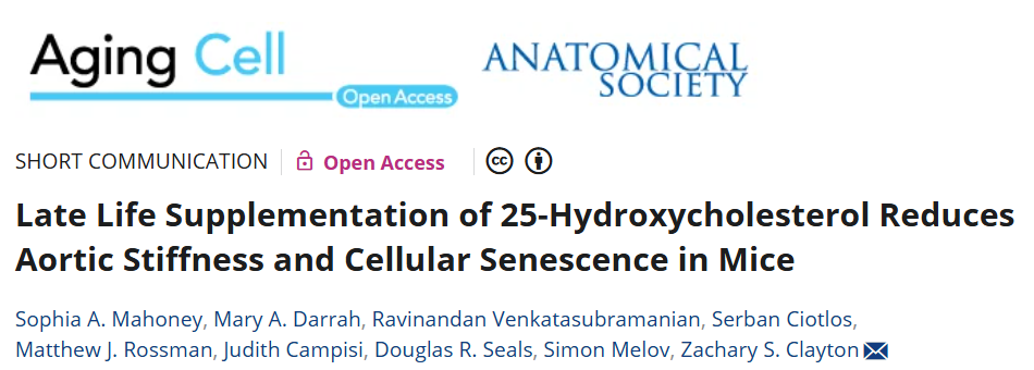 [1] Mahoney, S. A., Darrah, M. A., Venkatasubramanian, R., Ciotlos, S., Rossman, M. J., Campisi, J., Seals, D. R., Melov, S., & Clayton, Z. S. (2025). Late Life Supplementation of 25-Hydroxycholesterol Reduces Aortic Stiffness and Cellular Senescence in Mice. Aging cell, e70118. Advance online publication. https://doi.org/10.1111/acel.70118