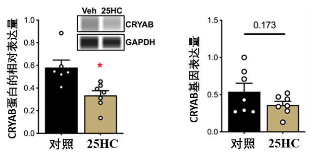 實驗結果有力地證實了 25-HC 對該靶點的抑制作用: 經由25-HC處理,老年小鼠主動脈中的CRYAB基因表達量與蛋白丰度相比對照均出現降低,分別降低了33%和38%。