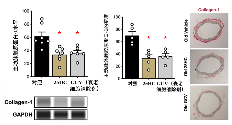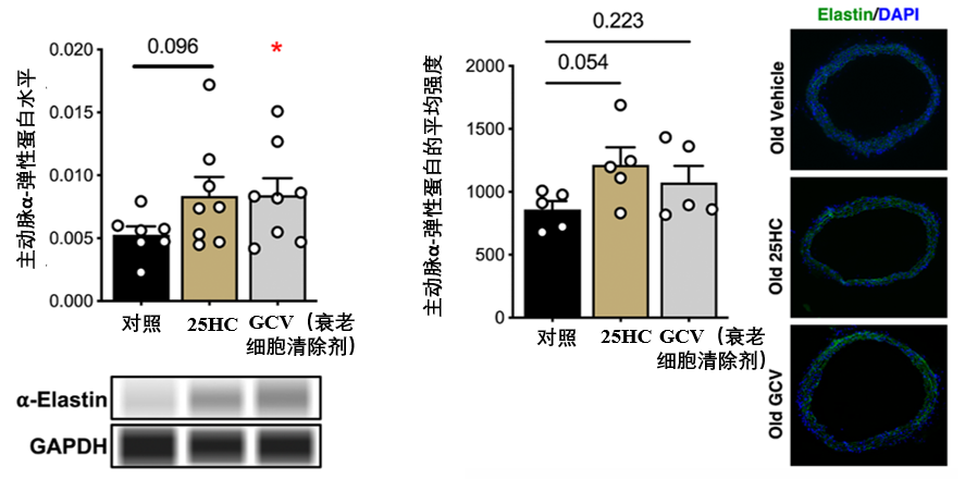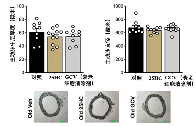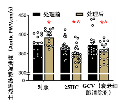 圖注:25HC在在降低血管僵硬度的效果堪比直接清除衰老細胞(效果與衰老細胞清除劑GCV相當)