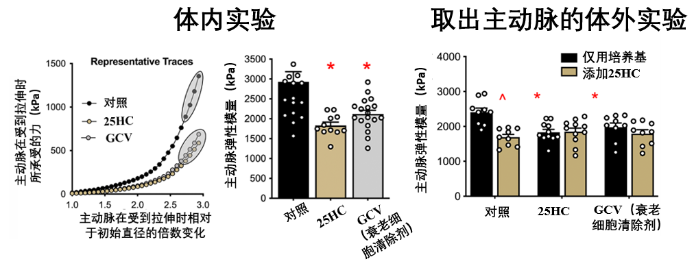 圖注:25HC可以降低衰老小鼠主動脈的內在機械硬度(越低柔韌性越好)
