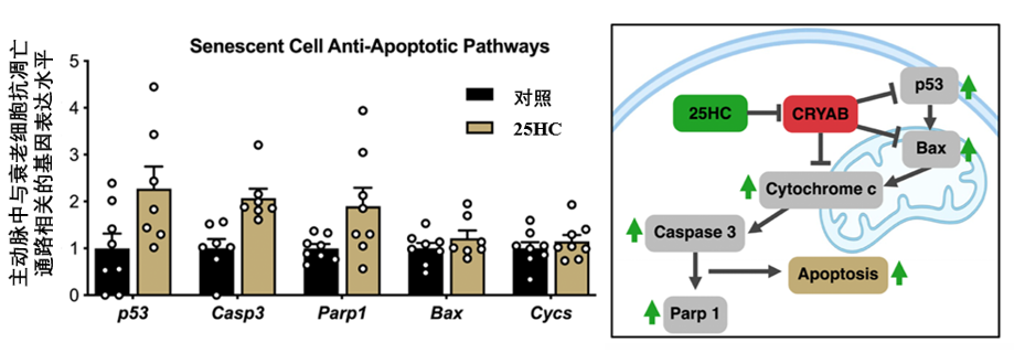 而當CRYAB被25-HC有效抑制後,原先被CRYAB等因素抑制的細胞凋亡通路就得以重新激活(p53、Casp3、Bax、Parp1、Cycs等),使得衰老血管細胞失去抗凋亡的保護,從而走向自我毀滅。