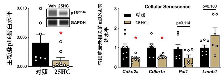 首先,25-HC能減少血管中衰老細胞的關鍵標誌物——p16INK4a蛋白的水平(約75%)。還沒完,再來個“一箭多雕”:多個與細胞衰老相關基因(Cdkn2a、Cdkn1a、Pai1)的表達水平降低以及Lmnb1的上調(其表達下調通常與衰老相關)。