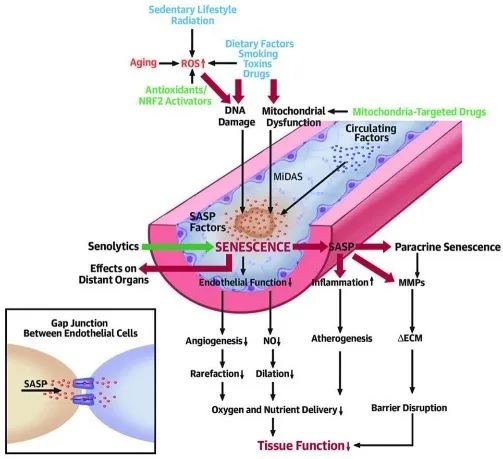 圖注:ROS、DNA損傷、毒素等因素共同誘導血管細胞衰老,通過SASP放大炎症與組織損傷[5]