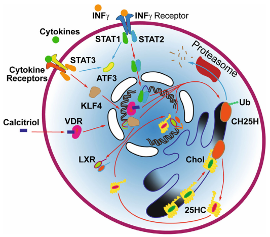 圖注:刺激維生素 D 受體 (VDRs) 可以激活 CH25H(是細胞內產生25-HC的主要酶)的表達