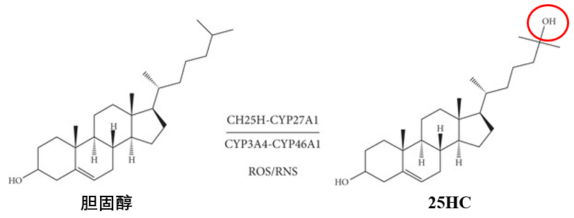 25-HC是膽固醇在第25位碳原子上多了個羥基(—OH)[7]。它廣泛分佈於人體的血漿、肝臟、肺、腦組織及免疫細胞(如巨噬細胞)中,兼具脂質代謝、免疫調節和抗病毒防禦三重功能。