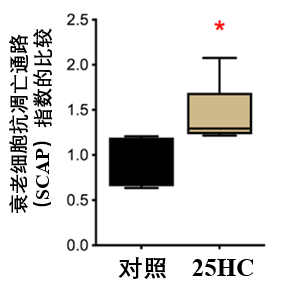 結果則是,25-HC組的SCAP指數明顯高於對照組,説明25-HC通過抑制抗凋亡因子CRYAB,調控衰老細胞內的抗凋亡/促凋亡信號之間的平衡,最終達到清除衰老細胞、改善血管健康的目的。