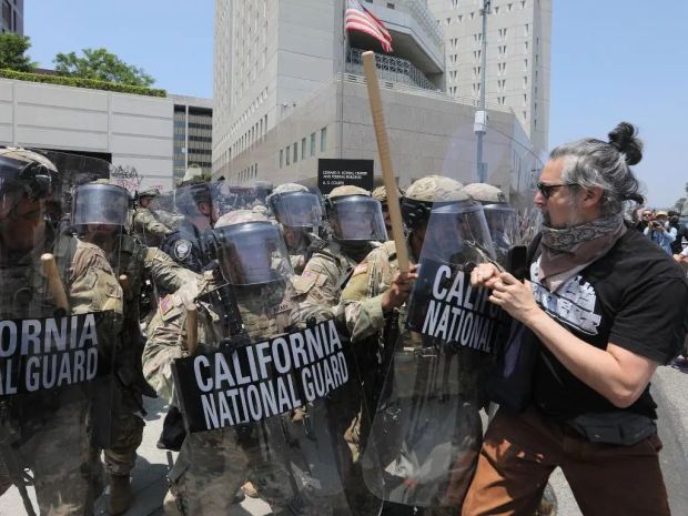 ▲6月8日,在美國加利福尼亞州洛杉磯市中心的聯邦執法機構門前,抗議者與國民警衞隊人員發生衝突。(圖源:新華社)
