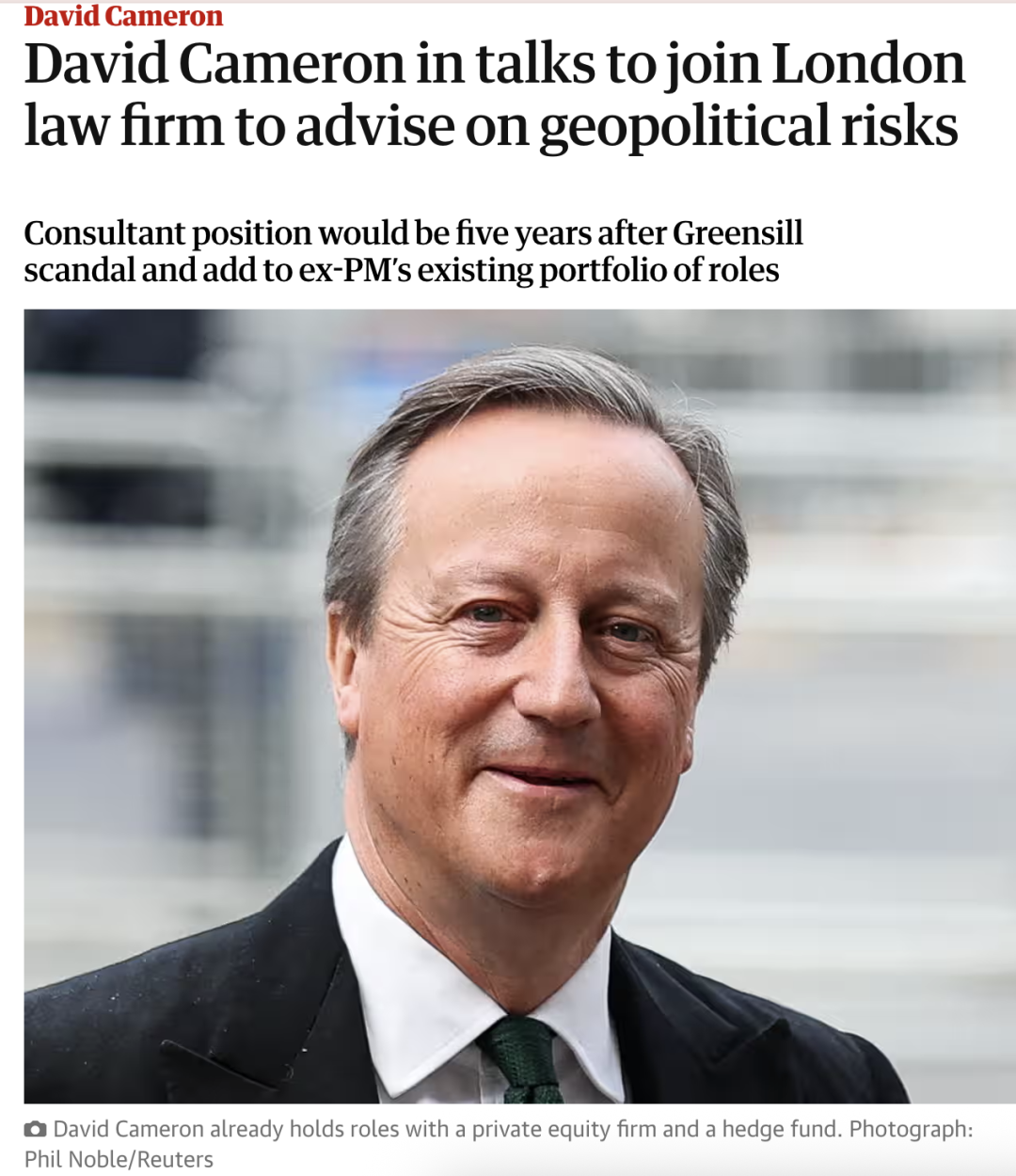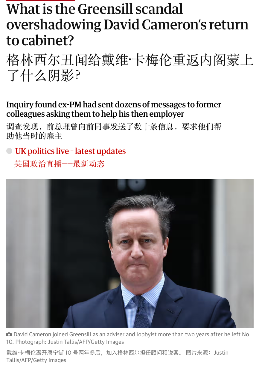 雖然政治人物轉戰律屆有些先例,但像卡梅倫這樣把國家命運捏在手裏的人,現在來給律所「做做風控」,確實帶着一點不真實的荒誕氣質。