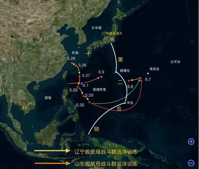 日本防衞省9日聲稱,發現中國山東艦在連接伊豆諸島及關島的第二島鏈附近的衝之鳥礁近海進行艦載機起降。此前防衞省曾發佈消息稱,發現中國航母遼寧艦於6月7日至8日在南鳥島(屬東京都管轄)近海的太平洋活動。日媒渲染稱,“這是中國航母首次進入該海域”。