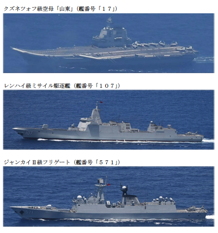 週六,日本海上自衞隊(JMSDF)的照片顯示,中國海軍航母“山東”艦(17號)、巡洋艦“遵義”艦(107號)、護衞艦“運城”艦(571號)和“衡水”艦(572號)以及艦隊油輪“查干湖”艦(905號)在宮古島東南341.7英里的海域航行。日本聯合參謀本部表示,週一,“山東”艦進行了艦載戰鬥機和直升機的起降作業。此次“山東”艦的部署正值“遼寧”艦(16號)及其戰鬥羣在菲律賓海活動之際。