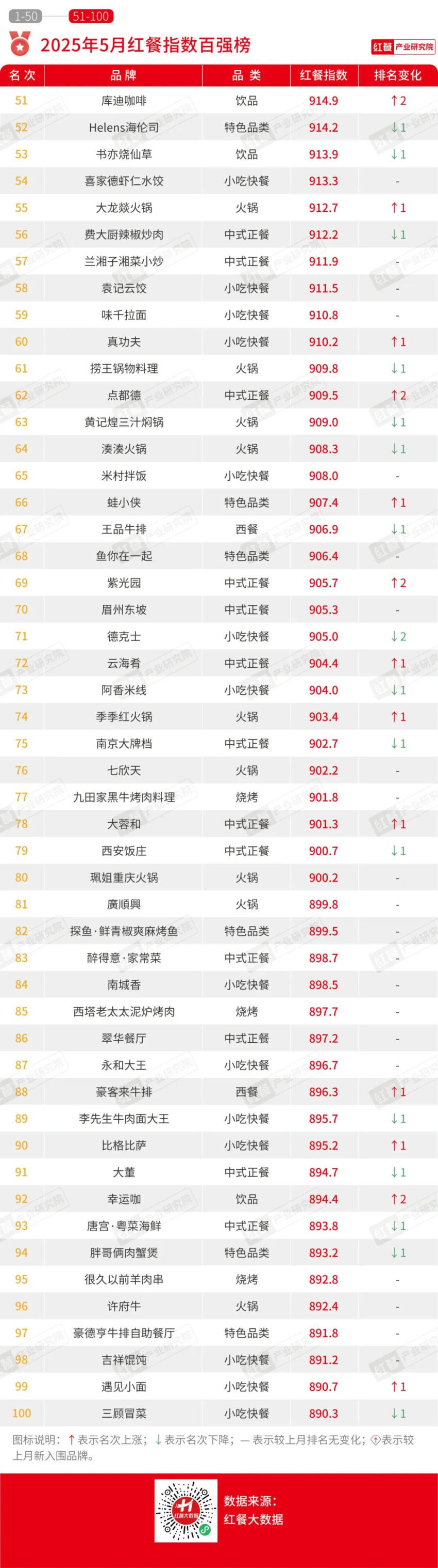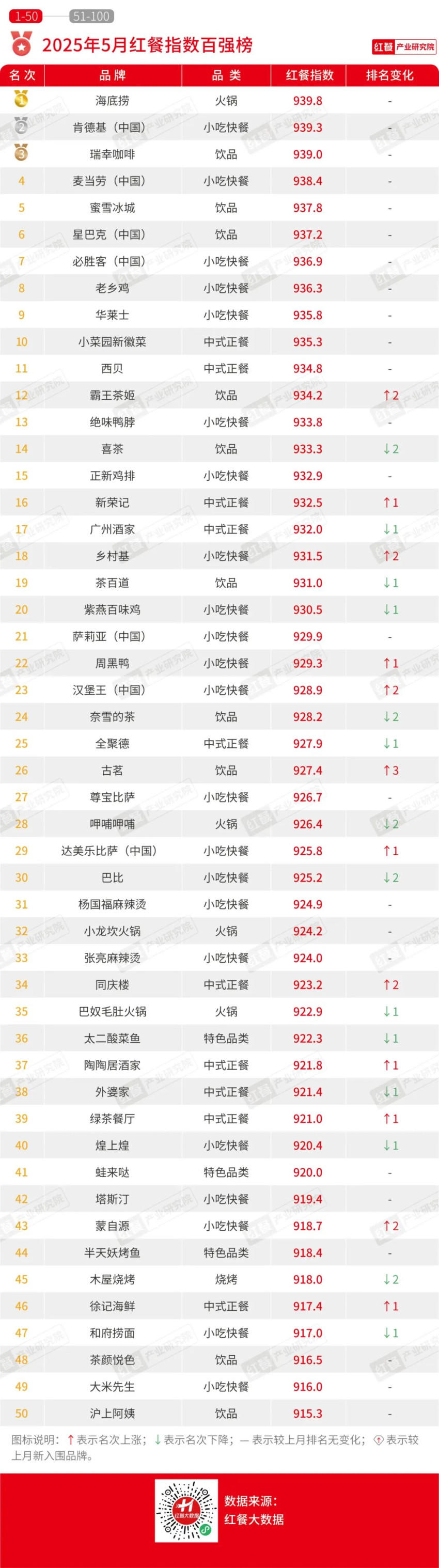 2025年5月,在“紅餐指數百強榜”中,品牌名次上升的有25個,名次下降的有30個,名次不變的有45個。處於榜單前三名的分別是海底撈、肯德基(中國)以及瑞幸咖啡,麥當勞(中國)、蜜雪冰城、星巴克(中國)、必勝客(中國)緊隨其後。