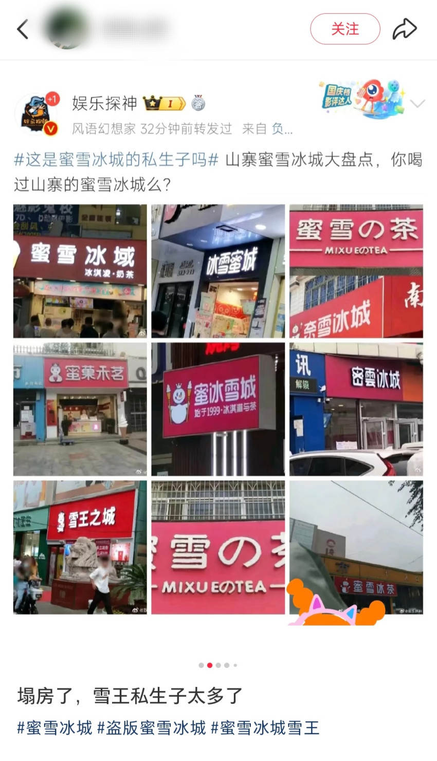 一直以來,蜜雪冰城都是新茶飲行業的“被山寨大户”。此前,相關話題#蜜雪冰城被複刻了#曾一度登上微博熱搜,不少網友曬出在全國各地發現的山寨招牌,比如與蜜雪冰城一字之差的“蜜雪冰域”“蜜夏冰城”,名字類似蜜雪冰城兄弟店的“蜜雪皇后”“蜜雪正新”等。網友們紛紛調侃:“這年頭連雪王都有對象了”“傳下去,蜜雪冰城和正新雞排有私生子了”……