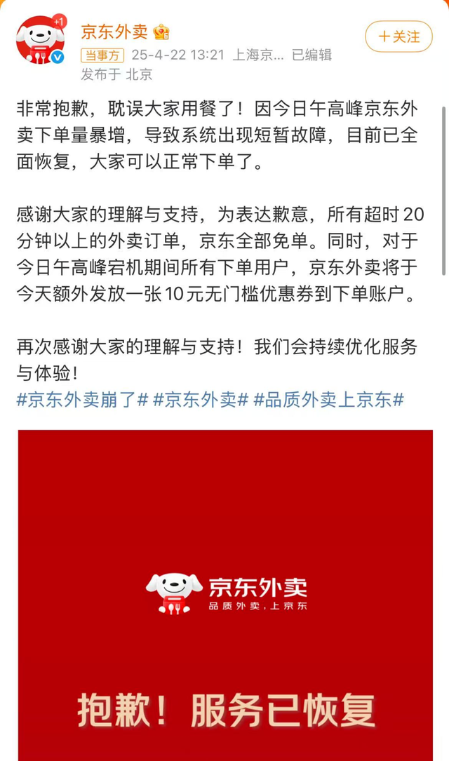 對此,京東迅速做出了回應,表示午高峯下單量暴增,導致系統故障。當時為了表達歉意,京東還宣佈,所有超時20分鐘以上的外賣訂單,全部免單。並且還為下單用户額外發放一張10元無門檻優惠券。