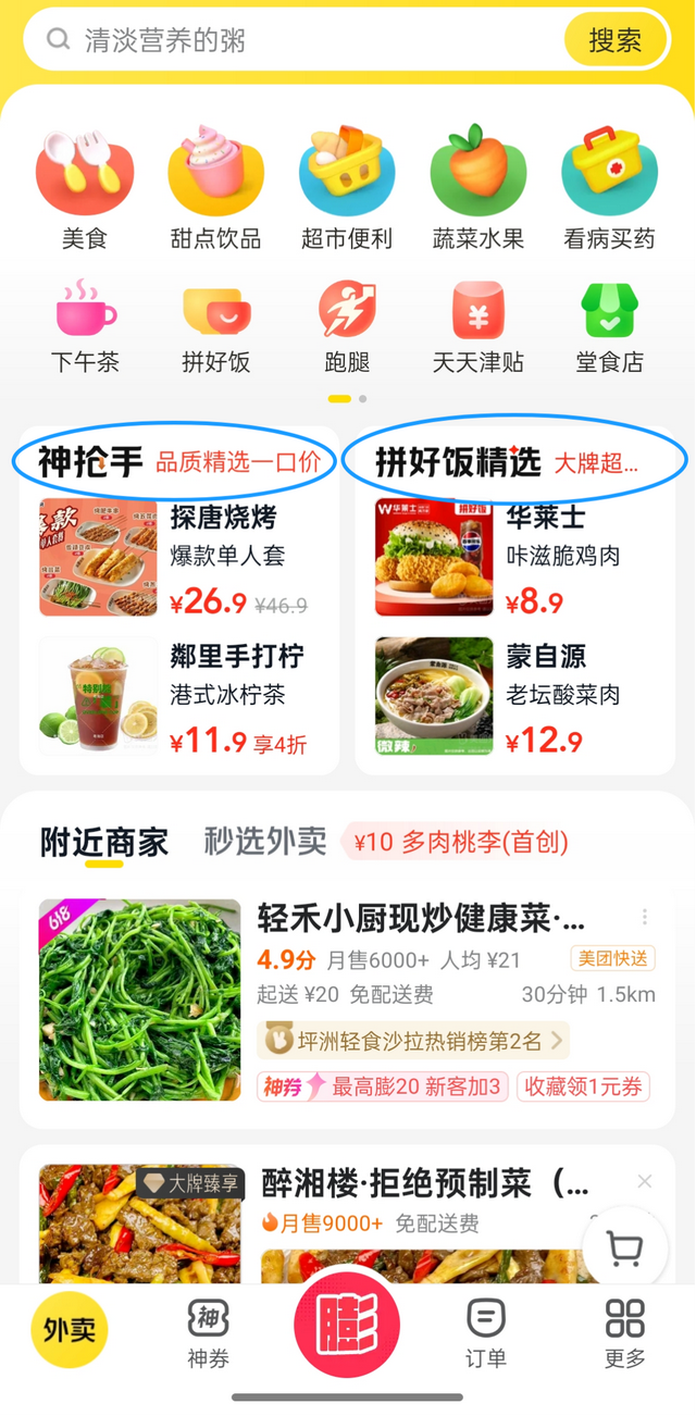 一個典型的例子就是,主打低價的“拼好飯”,被擺在美團外賣首頁的正中央位置,方便用户隨時購買低價外賣。
