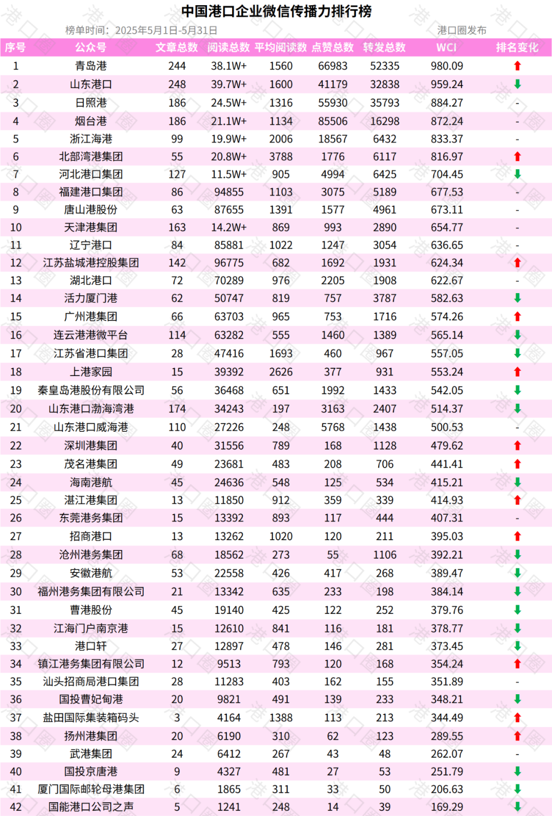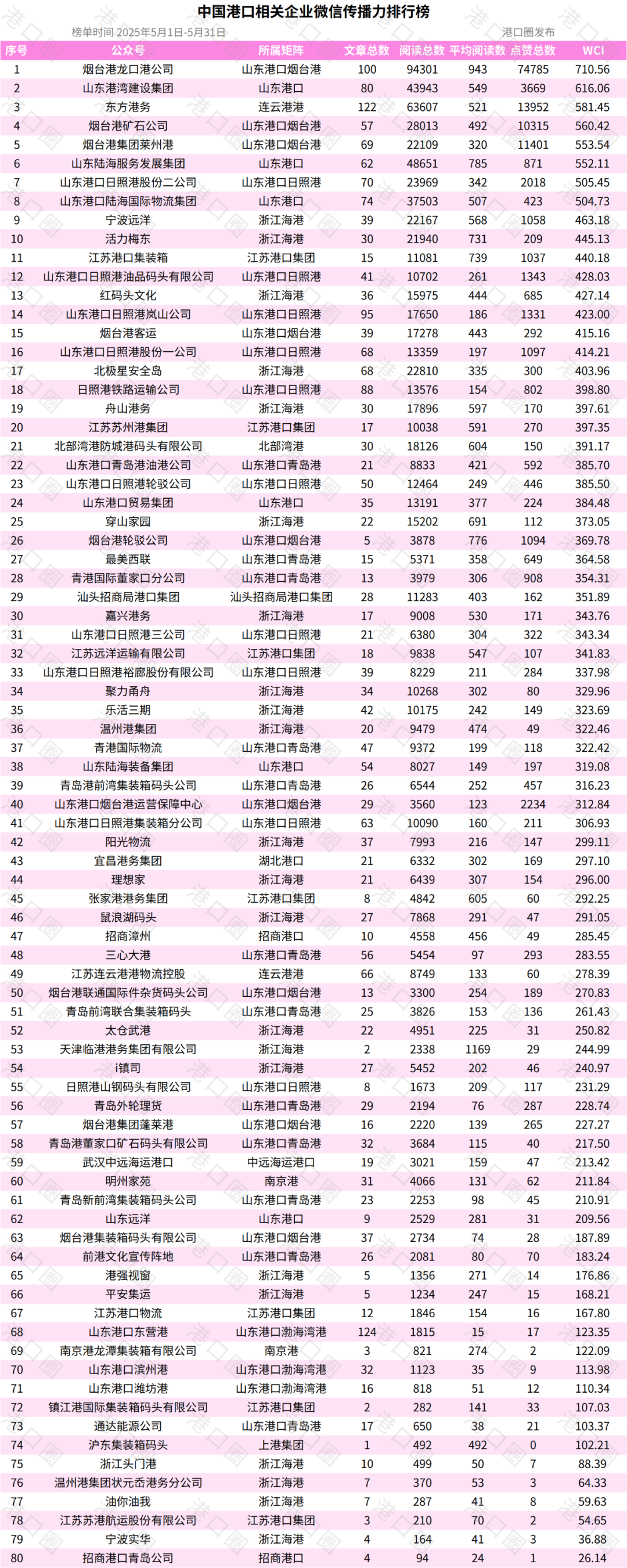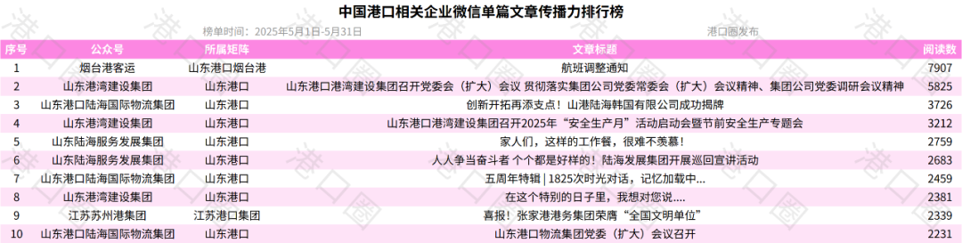 5月,中國港口相關企業微信傳播力排行榜前十為:煙台港龍口港公司(第1)、山東港灣建設集團(第2)、東方港務(第3)、煙台港礦石公司(第4)、煙台港集團萊州港(第5)、山東陸海服務發展集團(第6)、山東港口日照港股份二公司(第7)、山東港口陸海國際物流集團(第8)、寧波遠洋(第9)、活力梅東(第10)。