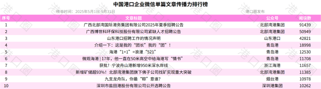 5月微信單篇文章傳播力排行榜中,北部灣港集團上榜3篇文章,其中2篇為招聘類推文,分別拿下榜單第一、第二,山東港口也有一片招聘內容上榜,拿下榜單第3,臨近高校畢業之際各大港口集團似乎又在醖釀着一場搶人大戰。此外,煙台港《九支龍舟隊,你最“粽”意誰》一文,以諧音梗破局,躋入榜單前十。