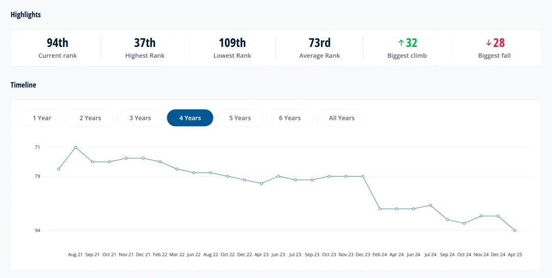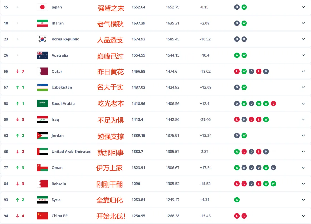 張路説出那番話的時候,國足FIFA排名第74名。此後國足一路走低,下滑勢頭從卡塔爾週期持續到了美加墨週期,等到了2024年10月時,國足排名已經下滑到第92名,雖然在戰勝印尼和巴林之後短暫上升到第90名,但來到2025年後,國足接連負於沙特、澳大利亞和印尼,在6月份對陣印尼和巴林之前,國足已經跌落至世界第94名、亞洲第15名。