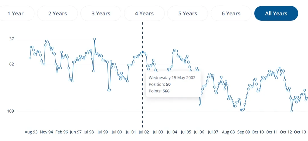 很多人可能會以為是2002年韓日世界盃的時候,因為那時候我們從亞洲出線了,但實則不然。世界盃前夕,國足最好排名是第50名,在前面的只有在家裏看電視的伊朗,以及日本、沙特和韓國(澳大利亞當時還不算亞足聯成員)。