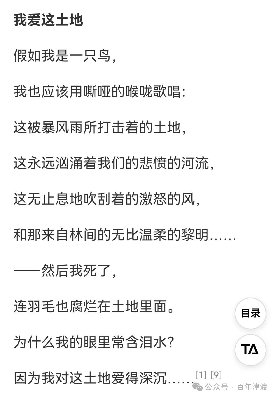 艾青作為地主家庭的兒子,其實有可能化為“一隻鳥”,離開這片戰火紛飛的土地,但因為他“對這土地愛得深沉”,所以他即使“然後我死了”,也要“連羽毛也腐爛在土地裏面”。詩歌充分表達了對這片土地的深情和願為之獻出生命的熱忱。